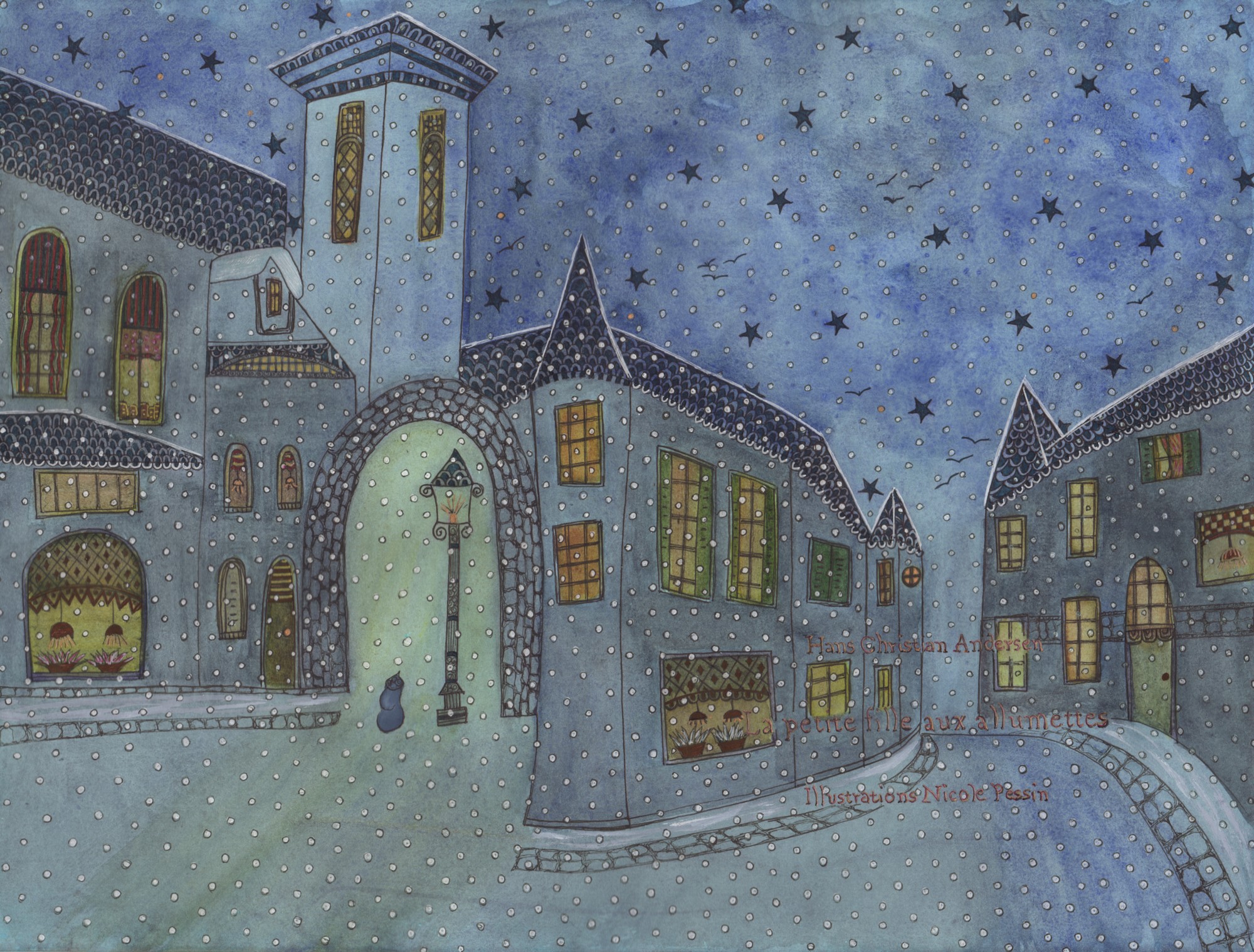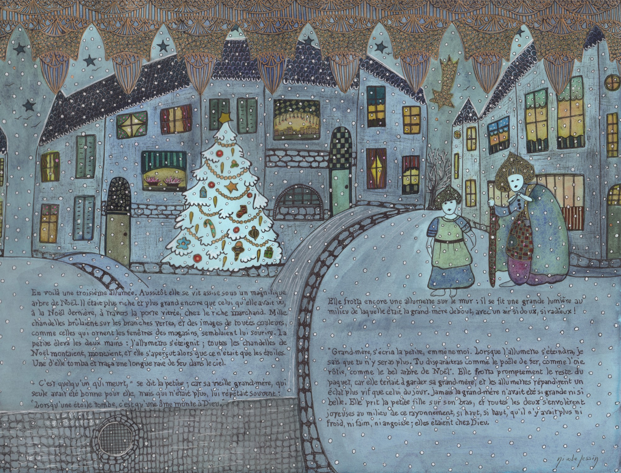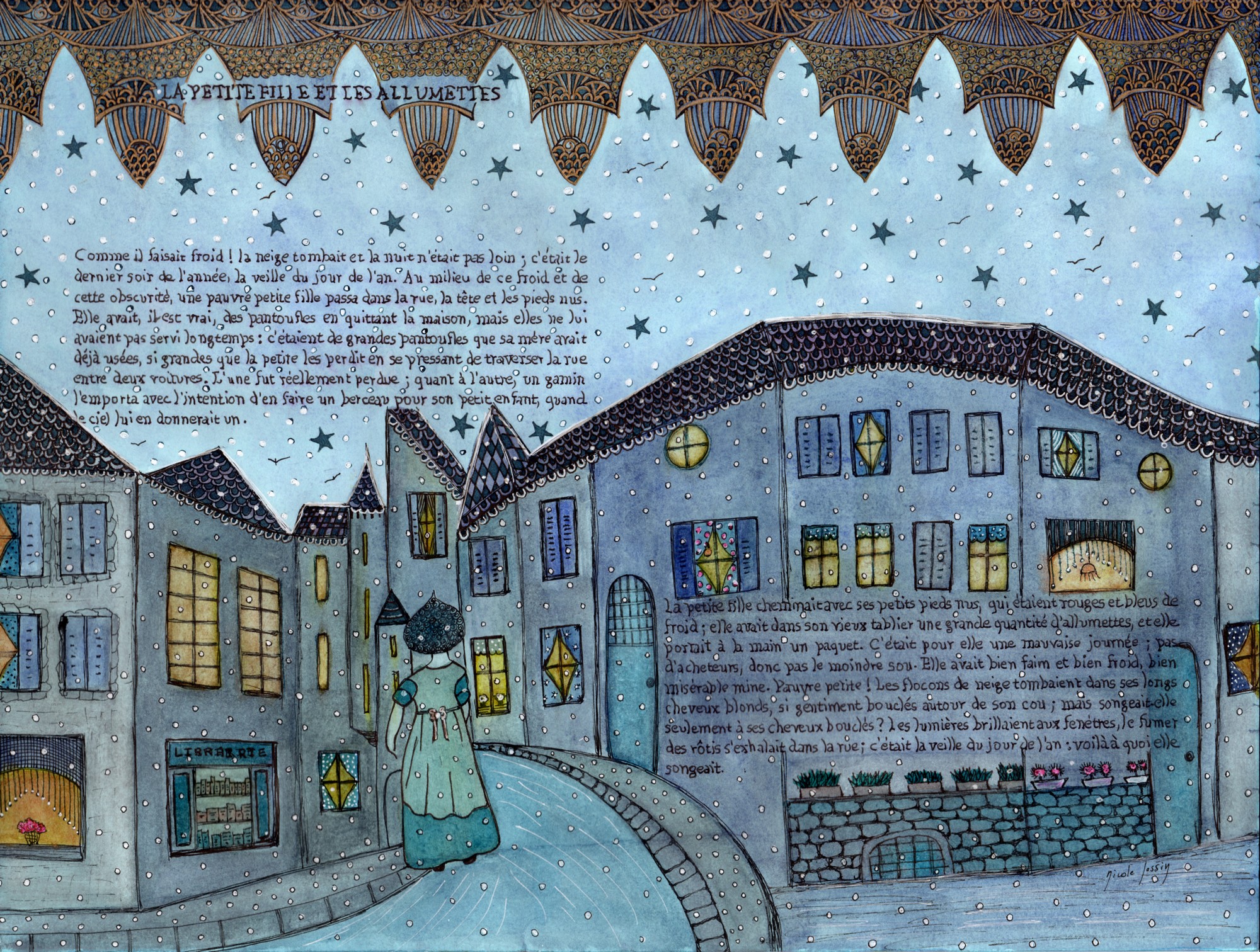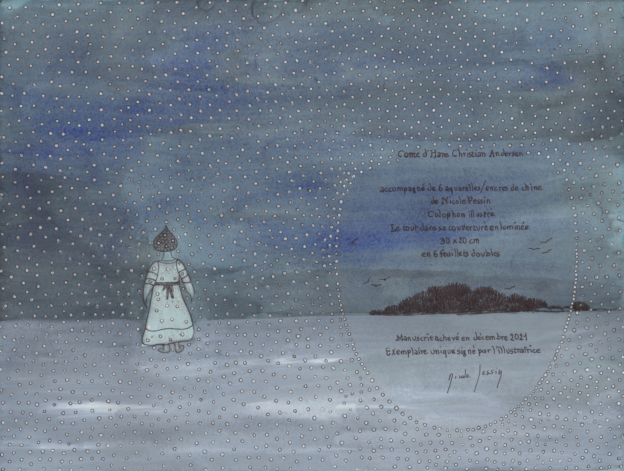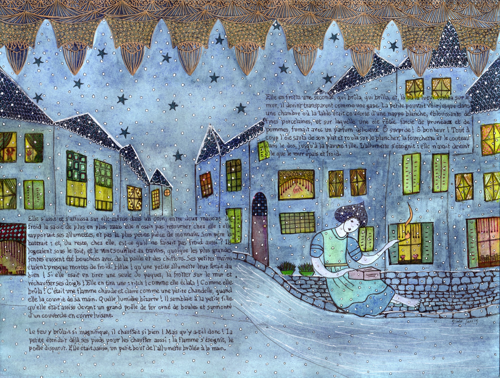 La petite fille aux allumettes – Conte d’Hans Christian Andersen accompagné de 6 aquarelles réhaussées d’encre de chine de Nicole Pessin – Colophon illustré – Le tout dans sa couverture enluminée – 30 cm x 20 cm.