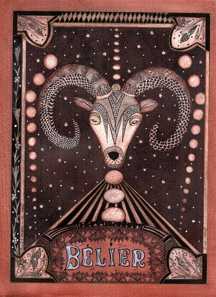 1.BELIER ← Précédent Suivant → Aquarelle & Encre de chine 2018. Légendes Célestes. Dominique Barbier – © Adagp, Paris, 2017