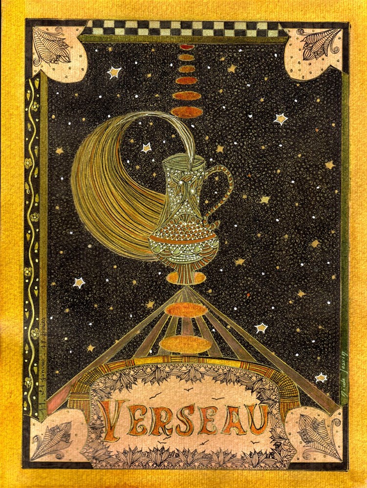 12.VERSEAU ← Précédent Suivant → Aquarelle & Encre de chine 2018. Légendes Célestes. Dominique Barbier – © Adagp, Paris, 2017