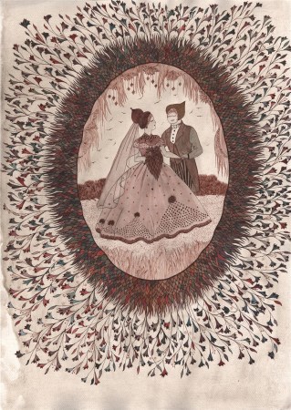 L’artiste, qui est une touche-à-tout de l’art, peut peindre la solitude de ses petits couples échangeant des serments dans l’enfermement d’un ovale ou d’un cercle qui les place, de fait, dans un authentique huis clos. Où régnerait à l’intérieur le calme grave et l’harmonie ; tandis que l’extérieur est granité de milliers d’infimes pointillés et plumetis, semblant en mouvement telles les limailles de fer attirées par des aimants ! D’où le paradoxe entre leur attitude amoureuse supposée être de bonheur et le péril né de leur situation.