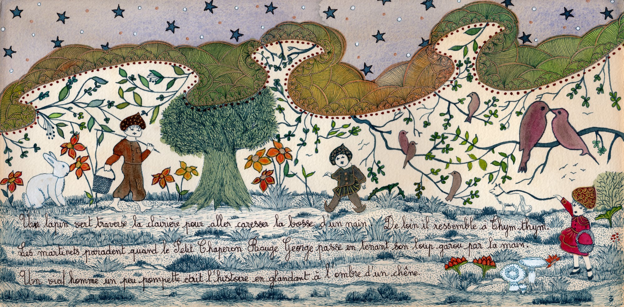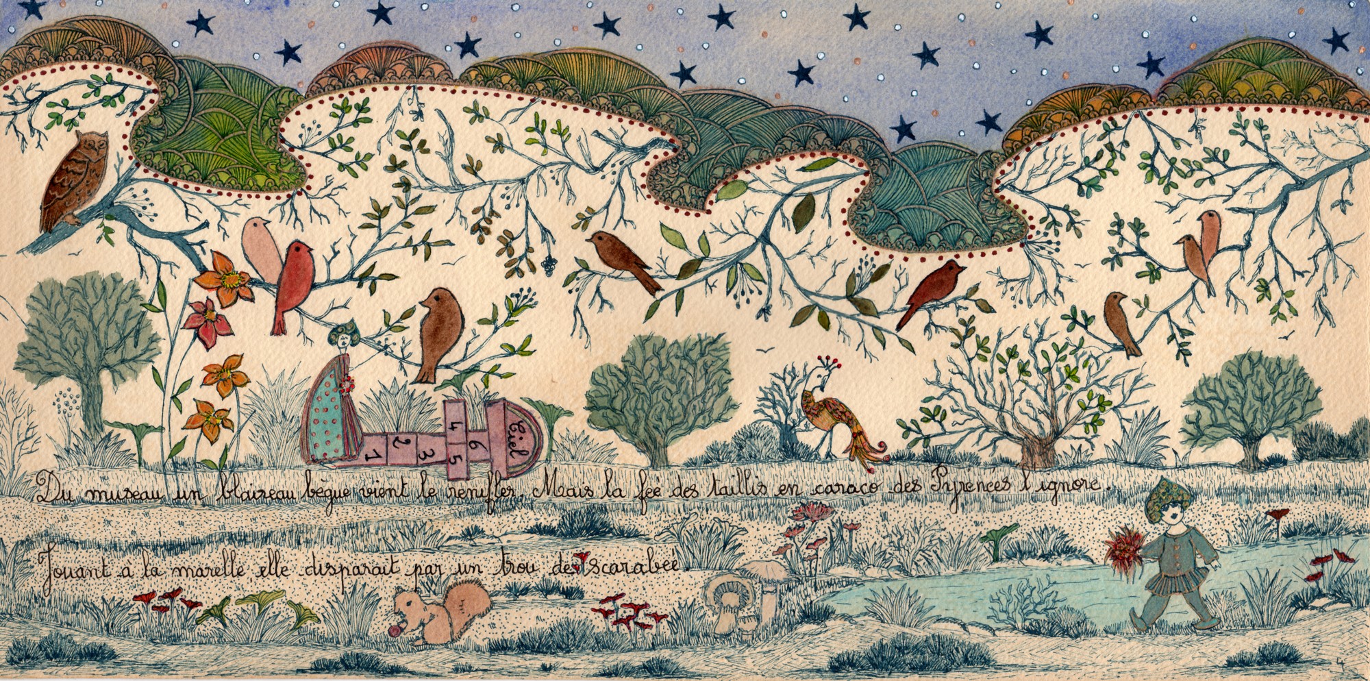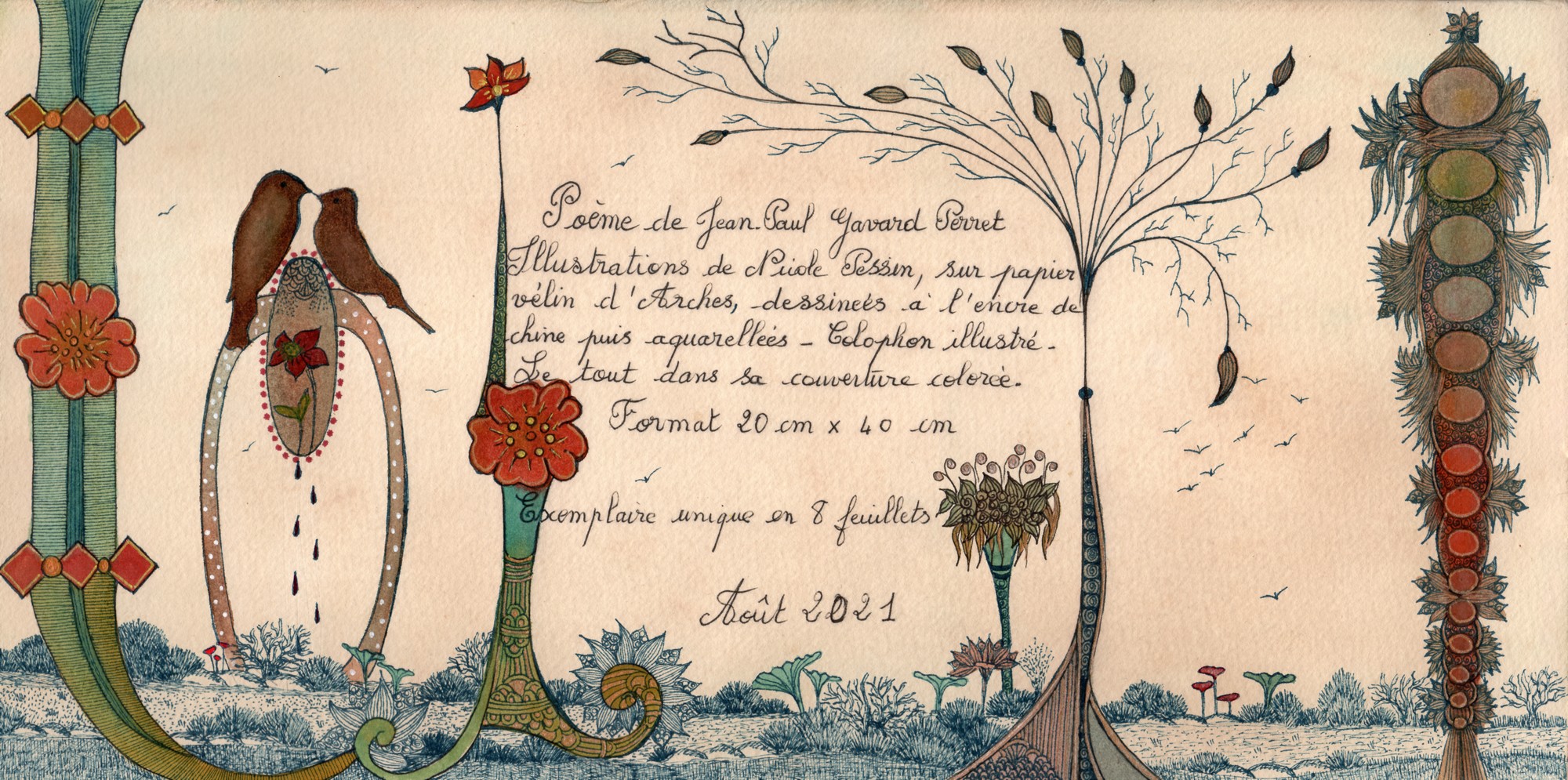 Illustrations de Nicole Pessin sur papier Vélin d’Arche dessinées à l’encre de chine puis aquarellées – Colophon illustré – Le tout dans sa couverture colorée.