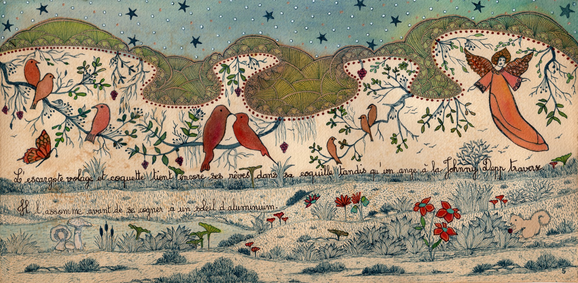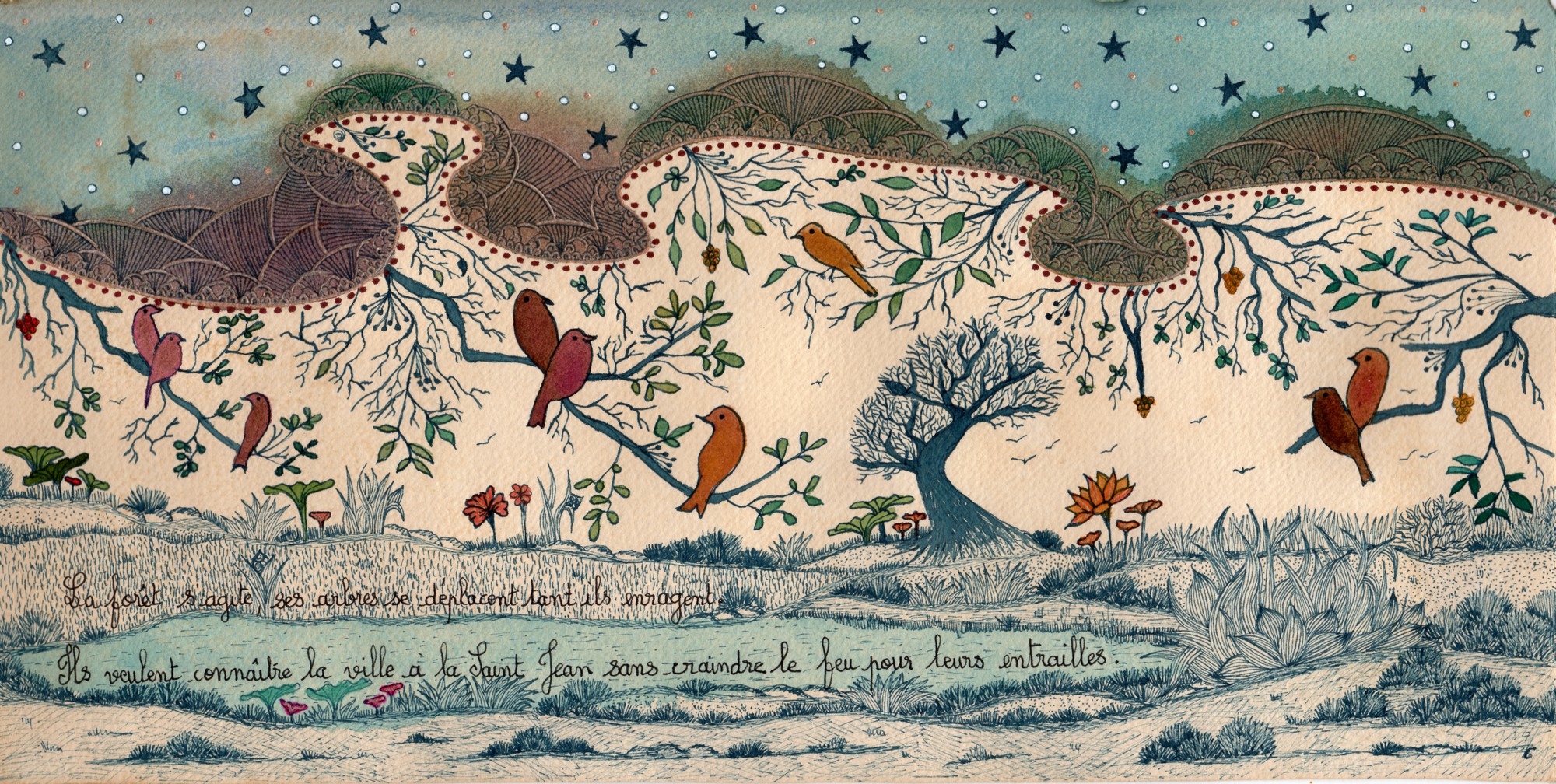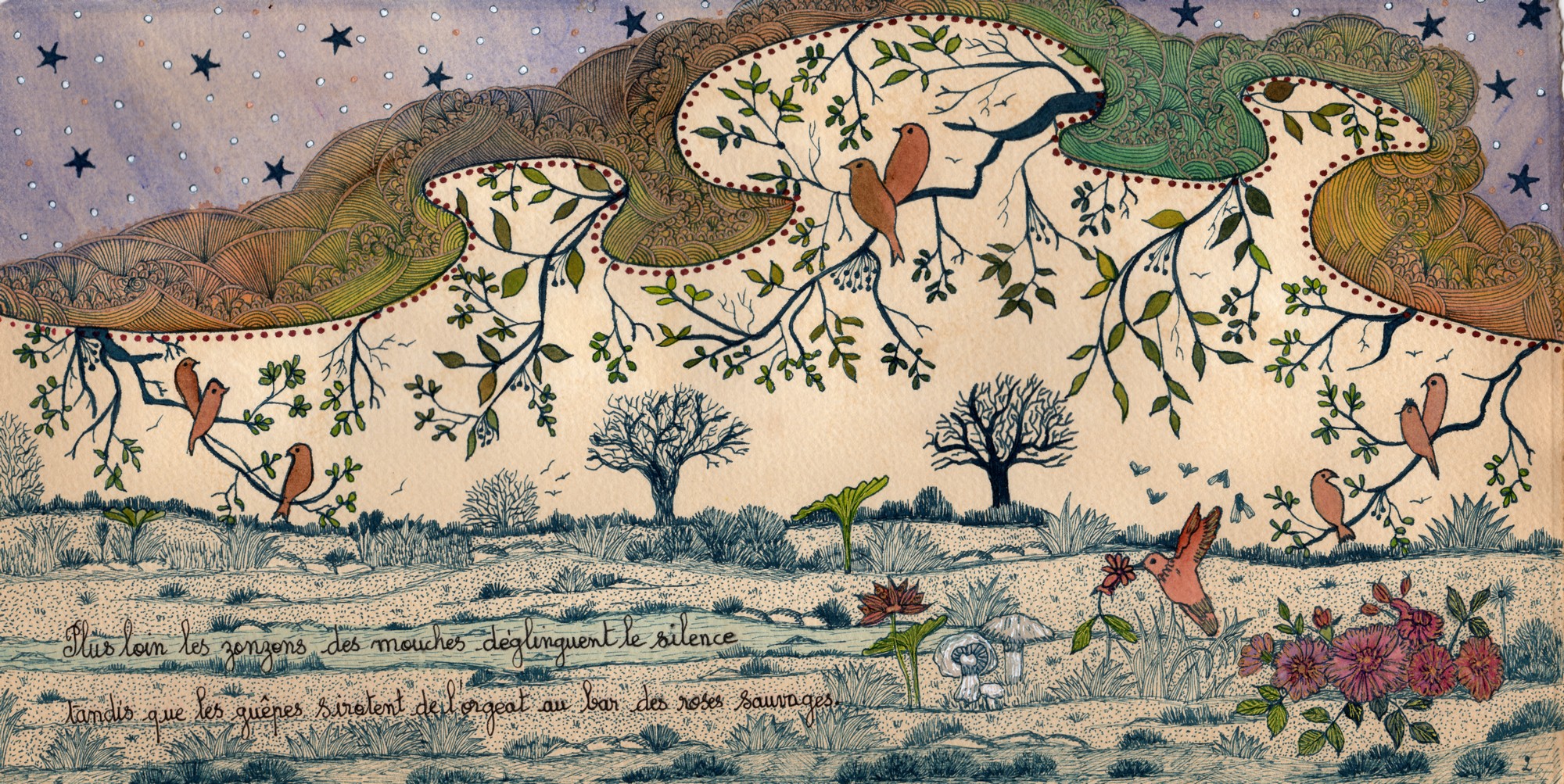 Illustrations de Nicole Pessin sur papier Vélin d’Arche dessinées à l’encre de chine puis aquarellées – Colophon illustré – Le tout dans sa couverture colorée.