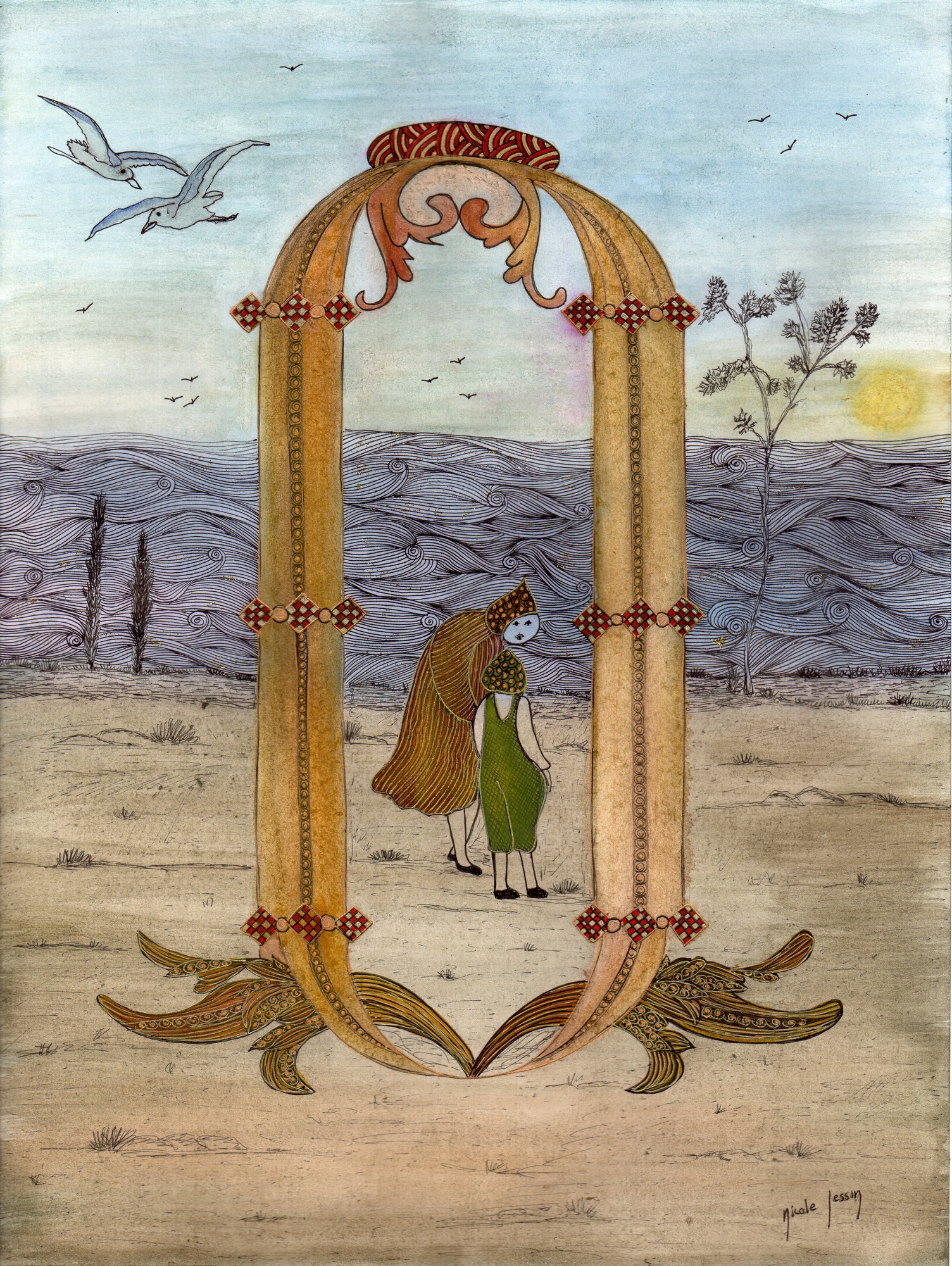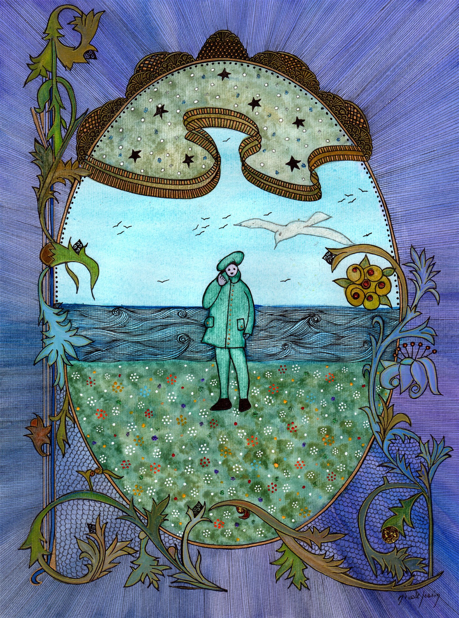 Il la prend, il la serre sur son cœur, et la mouette laisse le jeune garçon caresser doucement ses belles plumes blanches. Il lui dit qu’il est triste pour elle, qu’elle va guérir, qu’il a envie de voir la mer mais que c’est bien loin. Il lui dit qu’il l’aime déjà.