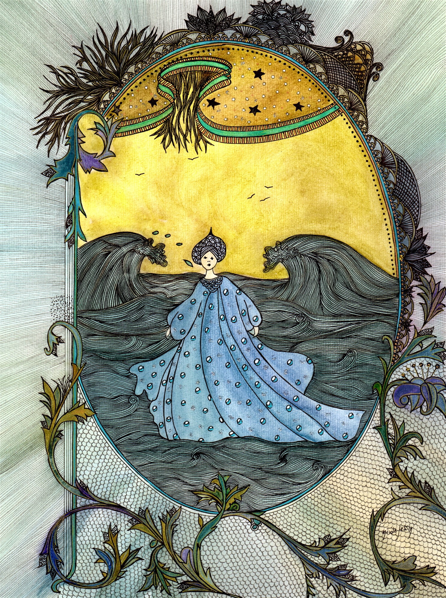 Autour de son visage, une écume douce et légère borde ses longs cheveux blonds. Sa robe à la couleur et la transparence de la mer profonde, là-bas, autour des îles et de merveilleux coquillages roses et blancs ourlent sa longue robe. Son visage à la douce teinte de l’aurore.