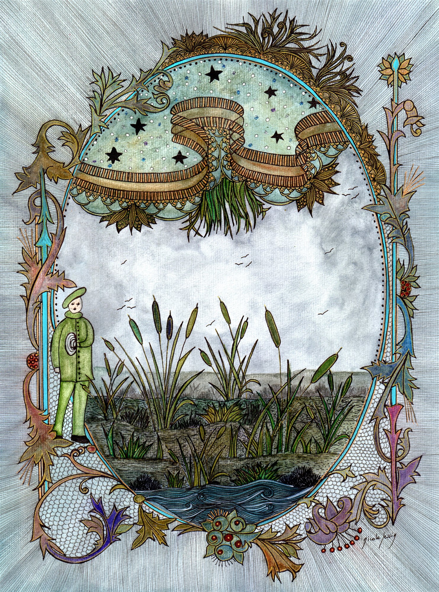 Il se souvient des paroles de la fée. Il serre le merveilleux coquillage, le caresse et sent une grande chaleur et un grand courage l’envahir. Il avance et les roseaux s’écartent devant lui pour lui faire passage et l’eau se retire sous ses pieds.