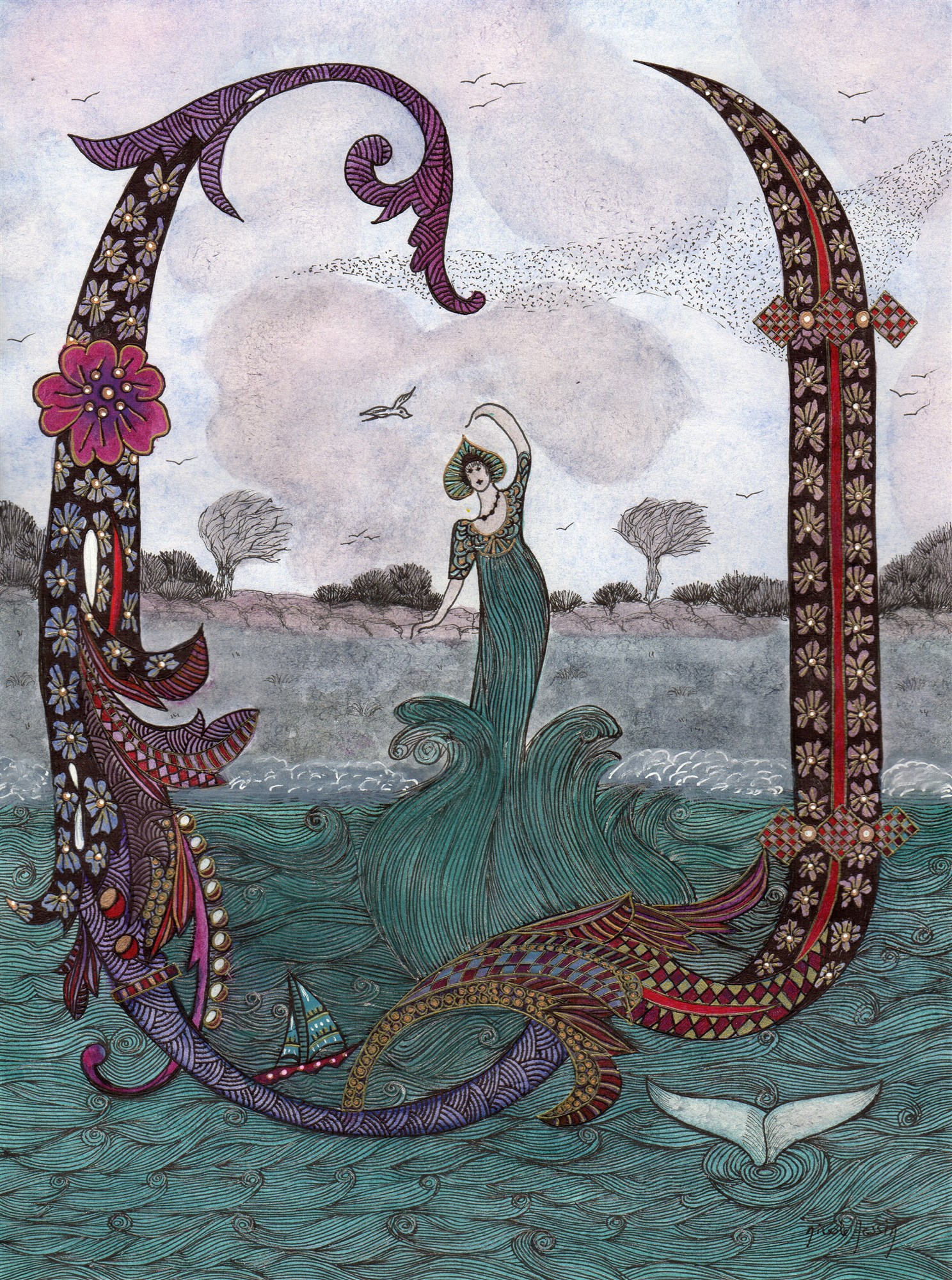 Et la fée de lumière, si fragile dans sa longue robe couleur d’écume et de mer calme, aussi légère que la brume de l’aurore, s’envole au milieu des embruns vers le monstre des profondeurs.