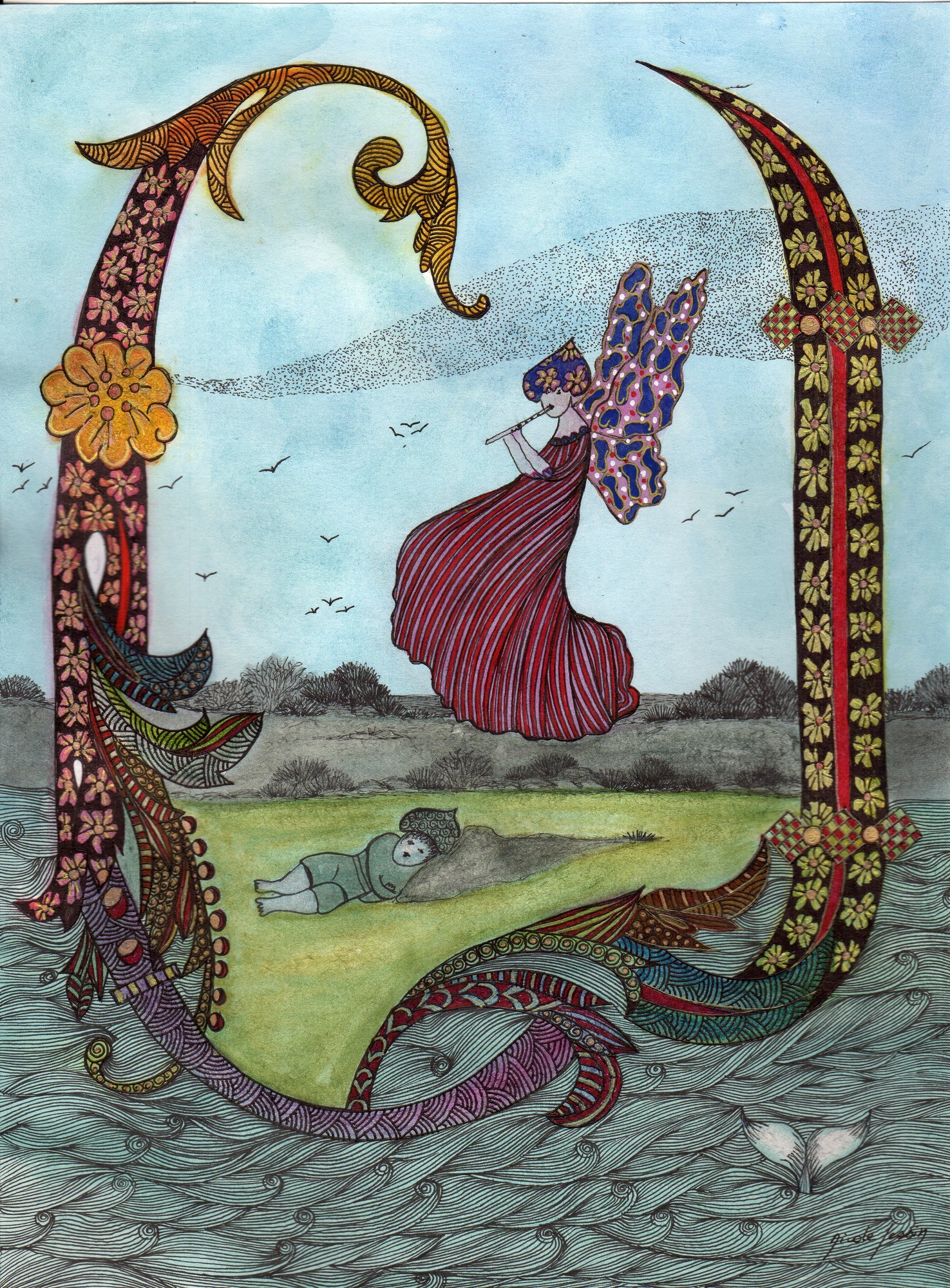 Il fait chaud, il a soif et il n’aperçoit toujours pas la mer. Il commence à se sentir triste et à découragé, alors, il s’assoit sur le talus d’herbe verte et s’assoupit.