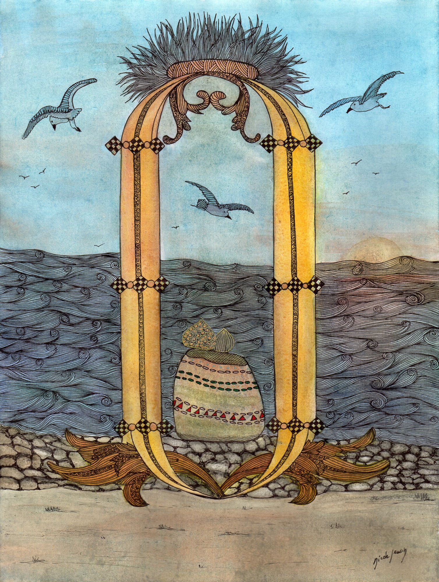 Ils chevauchent le rayon. Sous eux, la mer immense reflète le coucher du soleil et se dore de ses derniers rayons en lui volant des étincelles de toutes les couleurs qui se bousculent et dansent sur les crêtes des vagues blanches.