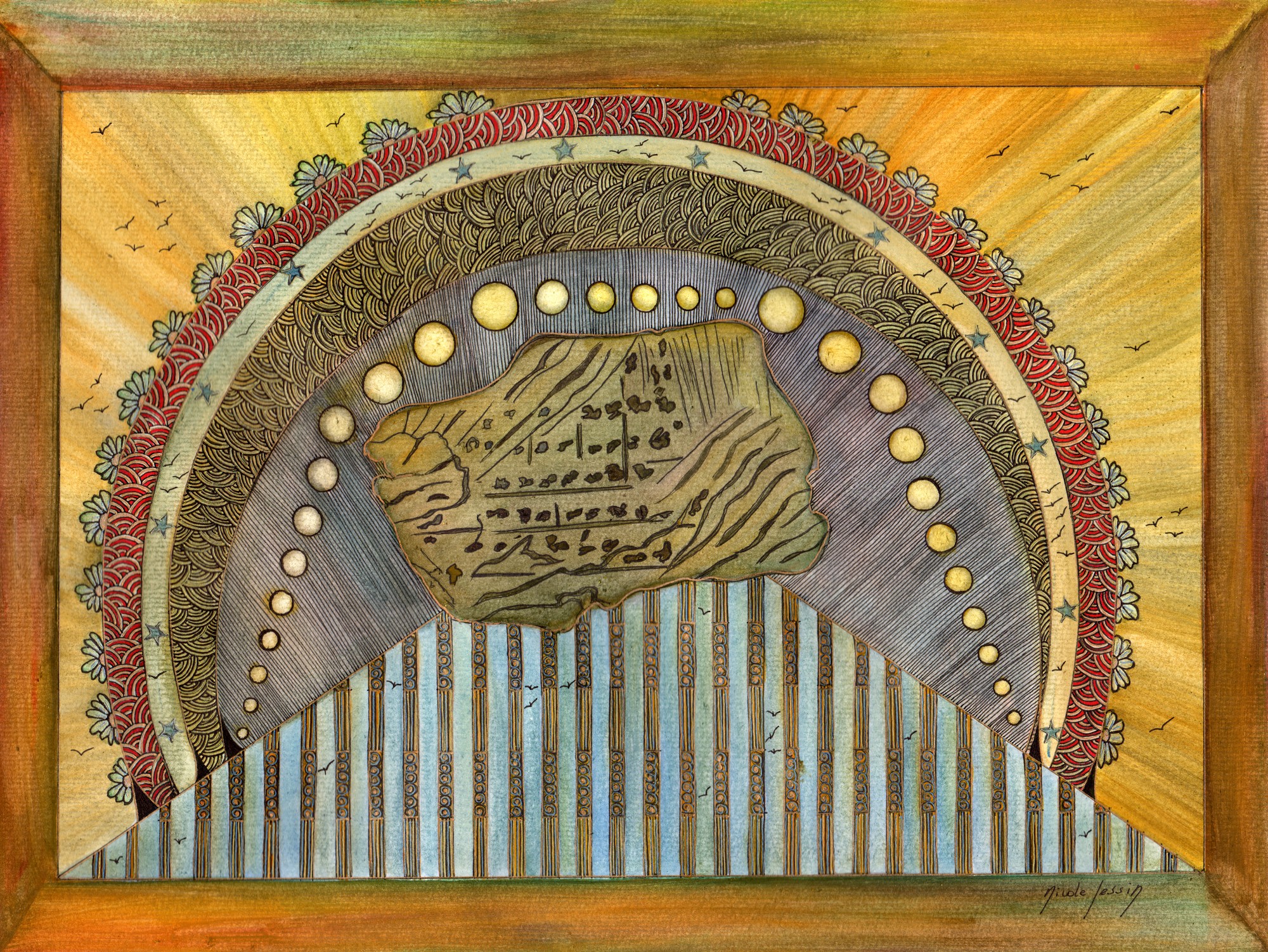 – Ainsi, selon que vous laisserez visible ces quelques inscriptions aux formes d’oiseaux, dit-il en désignant un groupe de mots finement sertis dans le dallage, vous obtiendrez : « La parole sera donné à celui qui vole ». Mais si vous occultez le premier signe, cela deviendra : « L’envol est un fil ouvert. » Dans une autre version où votre pied se poserait de l’autre côté de cette chaîne de mots, vous liriez encore : « L’ouvert est la parole d’un cercle en expansion. »