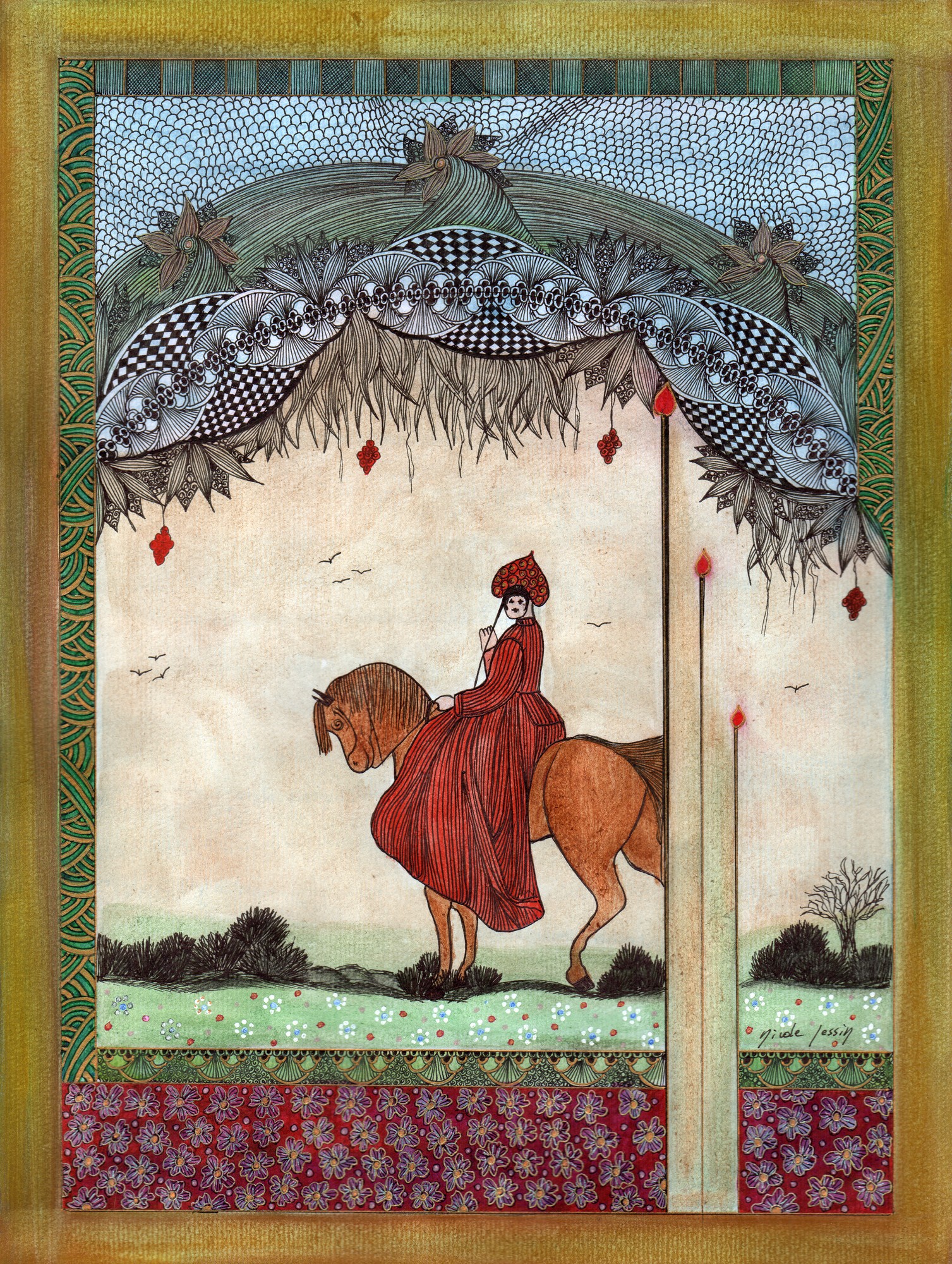 Elle s’étonna de tant d’égards. L’homme avait un visage sérieux et grave, mais sans hostilité, sans agressive impatience. Alors, sans rien demander, elle se dirigea vers l’animal et s’y hissa avec une aisance qui aurait surpris les villageois s’ils en avaient été témoins.