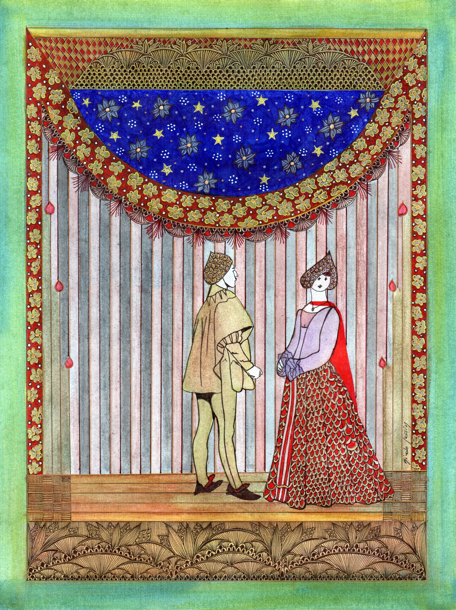 Quand la flambée resplendit, la jeune fille resta, embarrassée. Puis elle ouvrit un coffre qui se trouvait près de la fenêtre devant une tenture de velours vert sombre.
