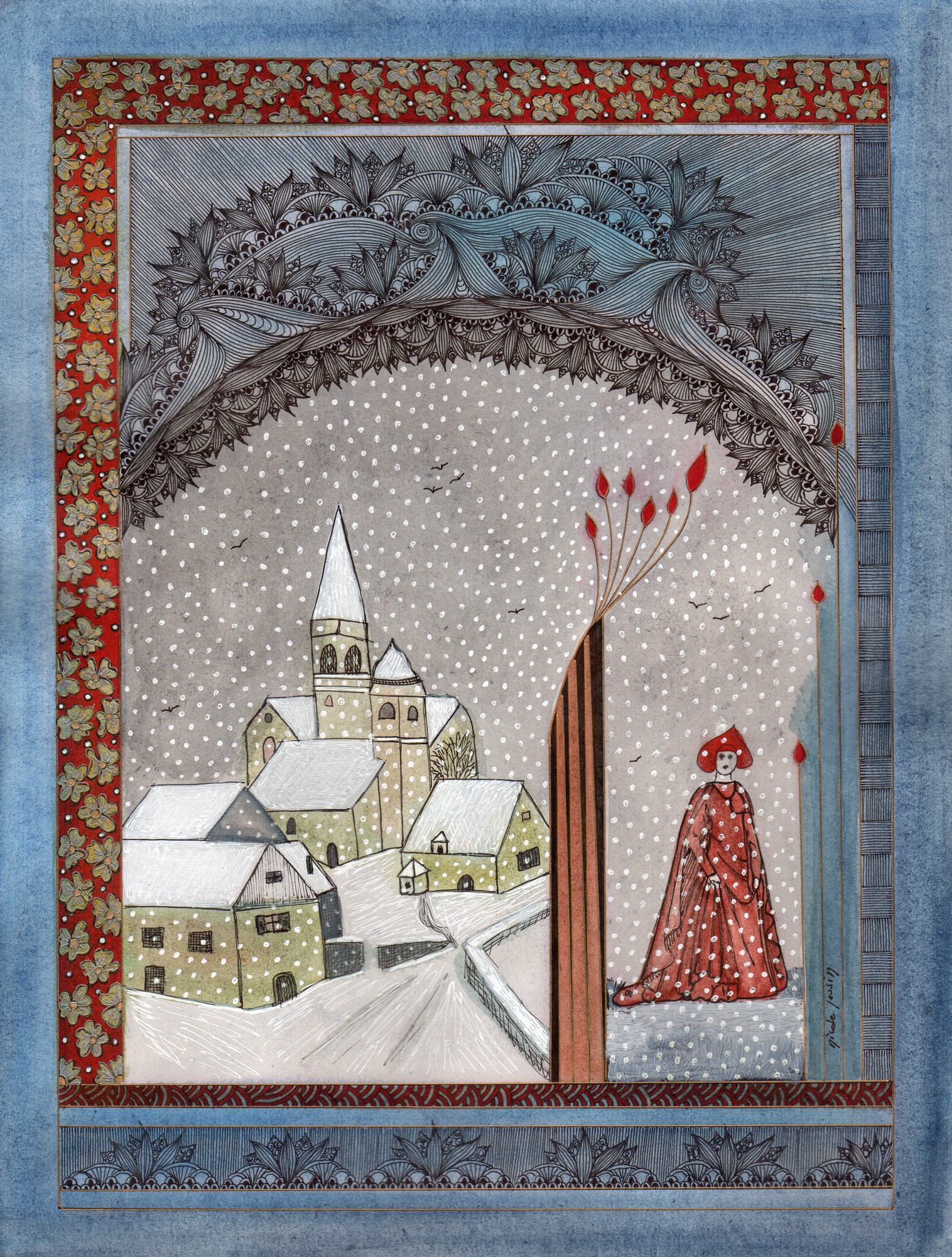 Cependant, la Bienveillante cheminait légère. Sa marche devenait vol, danse sous la lune froide de décembre. La lumière était nacrée et elle avançait , froidement accordée à ce paysage irréel que le givre illuminait de ses cristaux cruels. Nul âme qui vive , seul le hurlement lointain d’un loup isolé, parfois ; et qu’elle ne craignait pas .