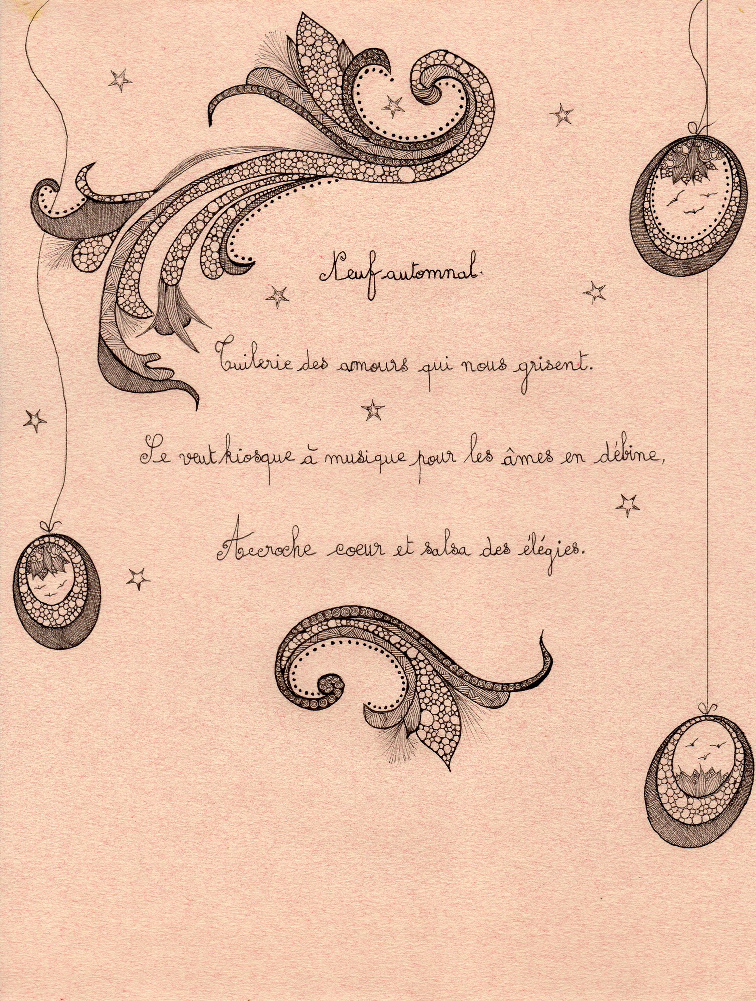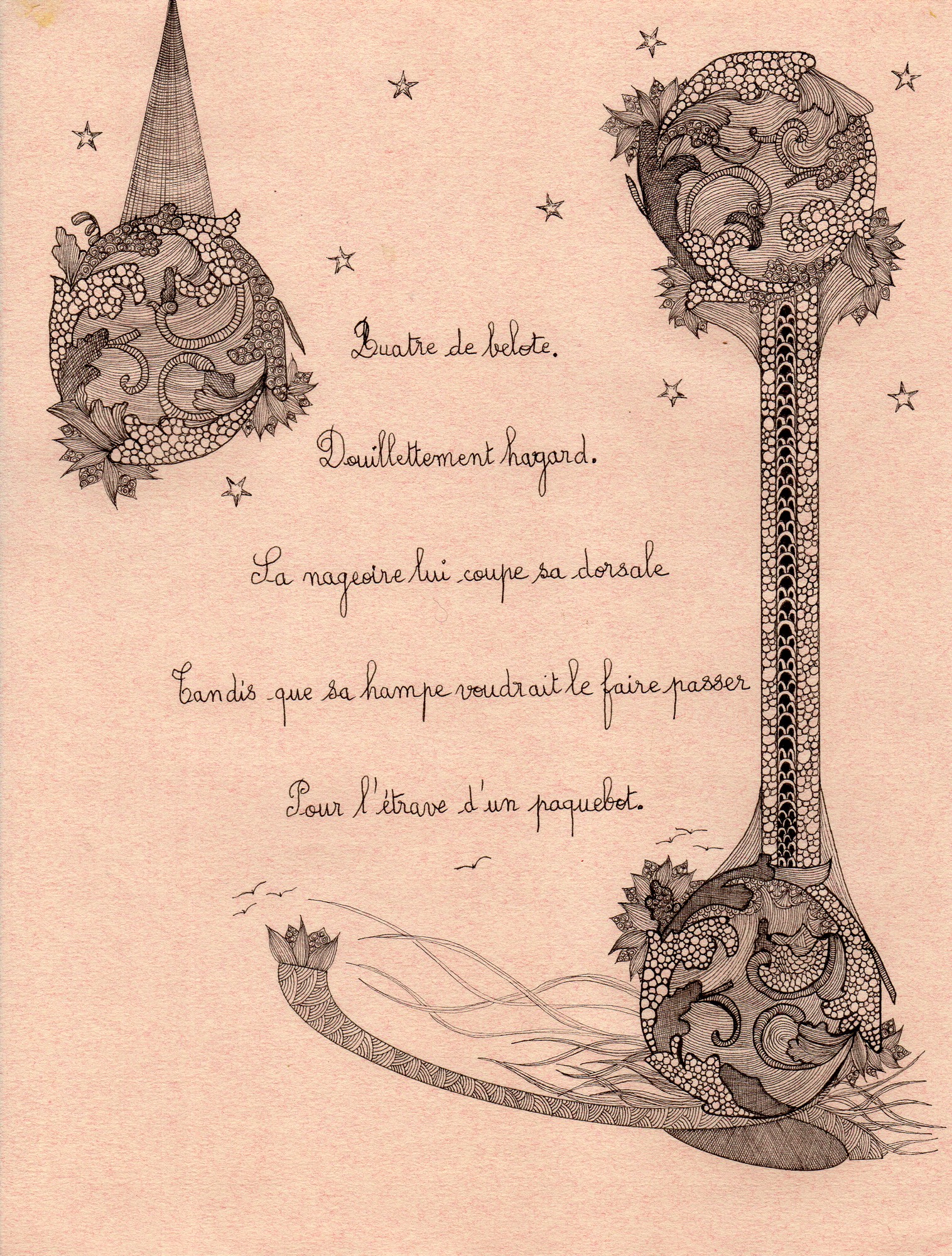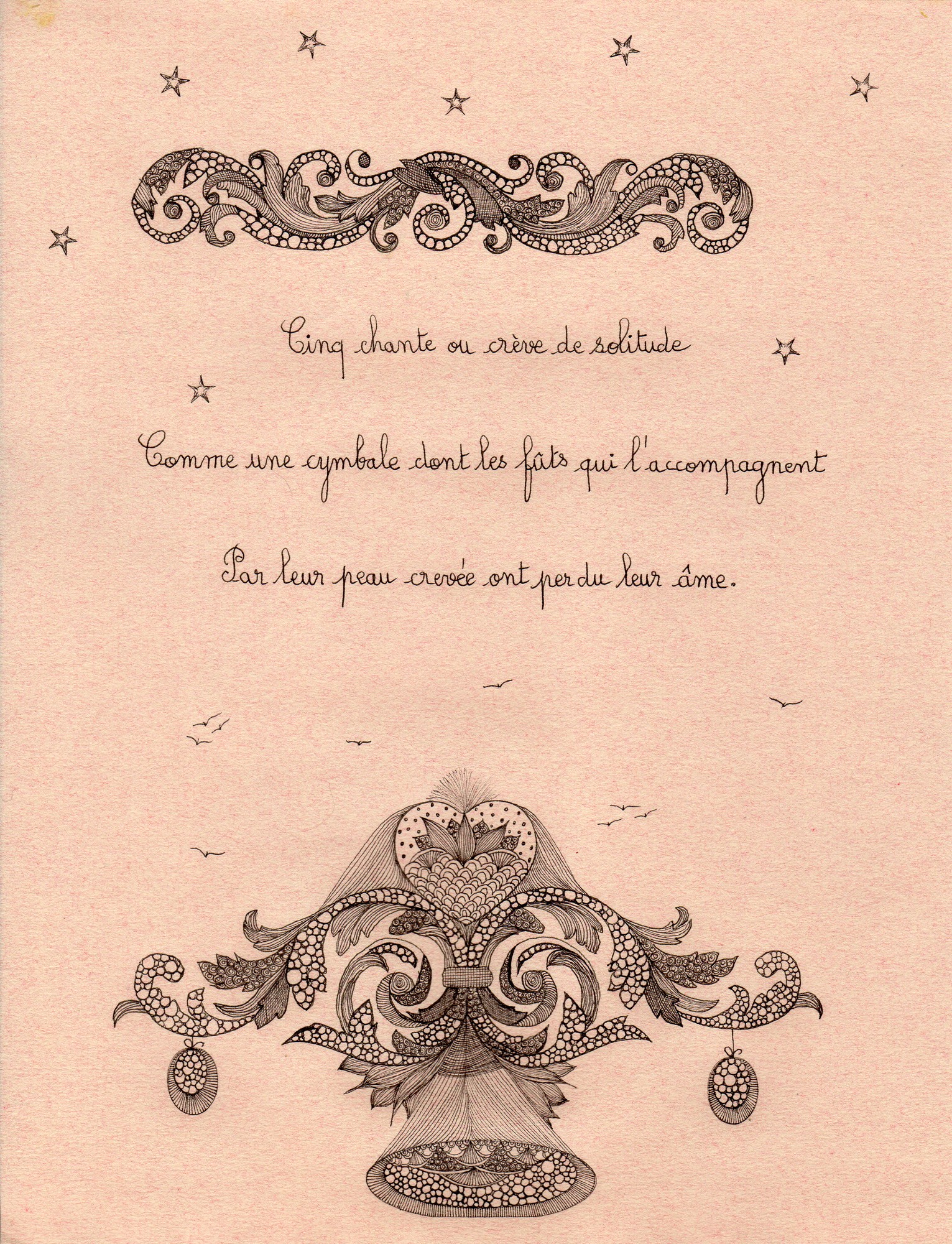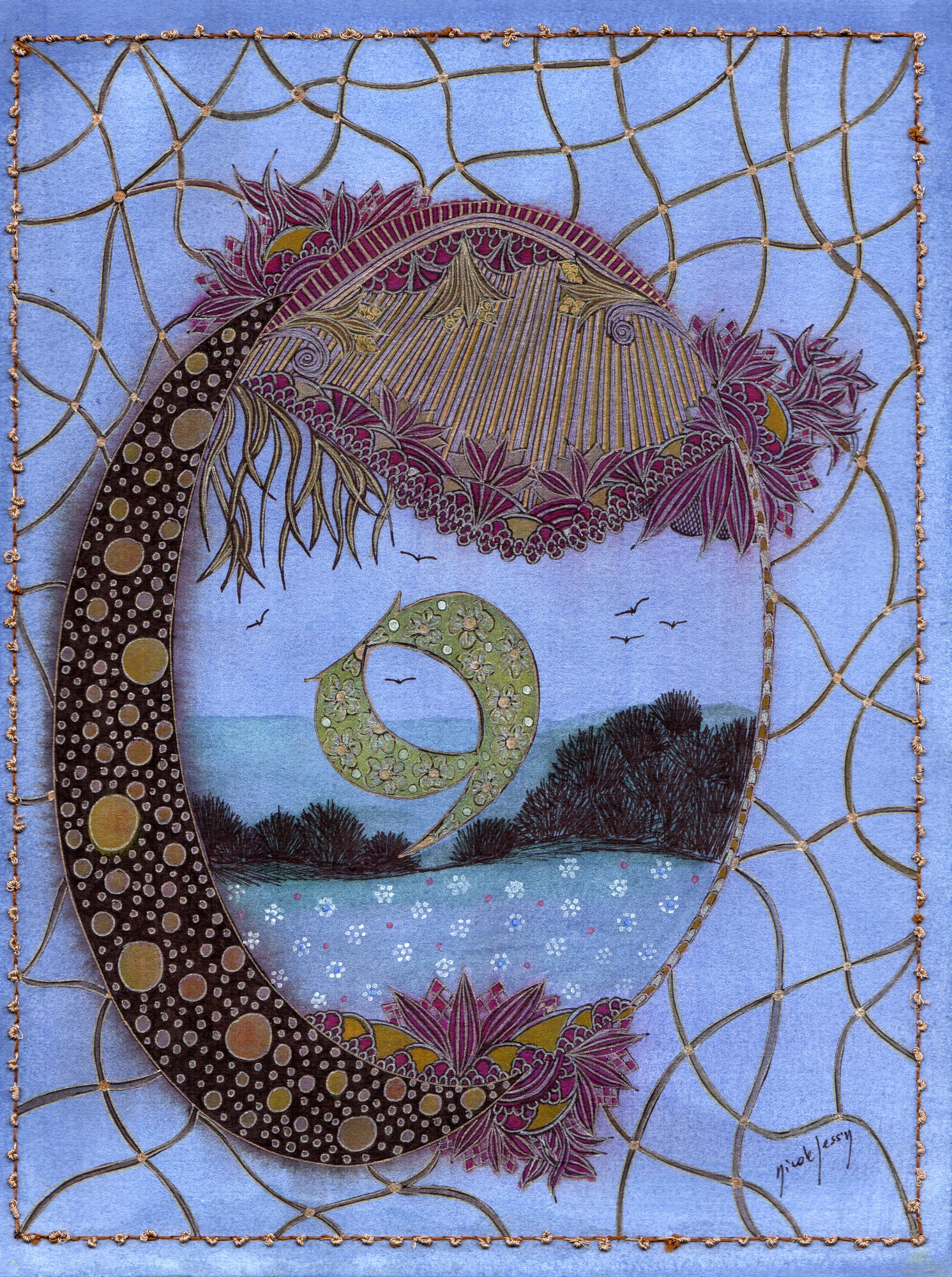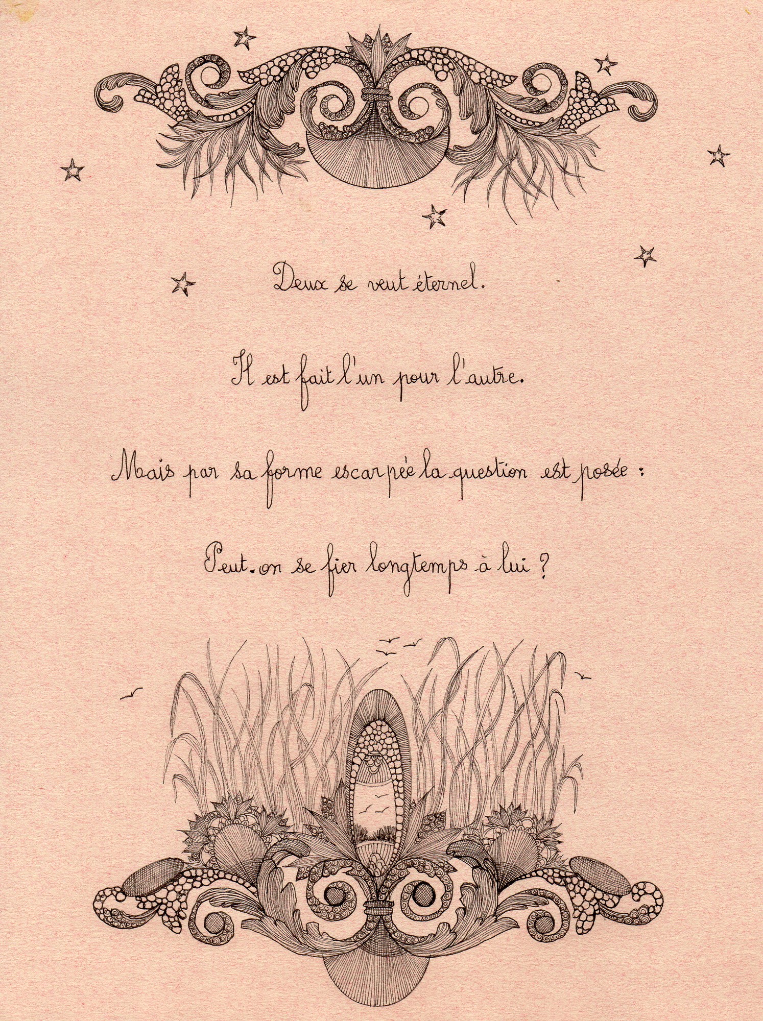 Cet ouvrage présente un poème de Jean-Paul Gavard-Perret. Il est illustré d’aquarelles rehaussées d’encre de Chine. Les illustrations sont enrichies de broderies réalisées au fil DMC et mêlées de fil de soie doré. L’ensemble est relié dans une couverture enluminée et parachevé par un colophon illustré.
